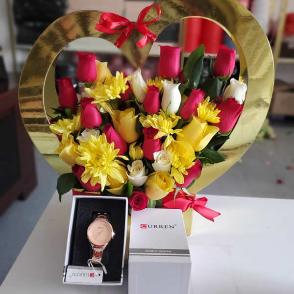 Get your loved one this amazing flower bag with curren gold watch. A perfect mix of fresh blooms and a watch as a souvenir for her.